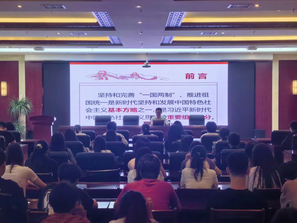 党委委员、副校长王海龙以“坚持和完善‘一国两制', 推进祖国统一”为主题,教育引导同学们高举习近平新时代中国特色社会主义思想伟大旗帜,紧密团结包括港澳台同胞在内的全体中华儿女,共同把握历史大势、坚守民族大义,共同开创中华民族的伟大复兴美好未来。