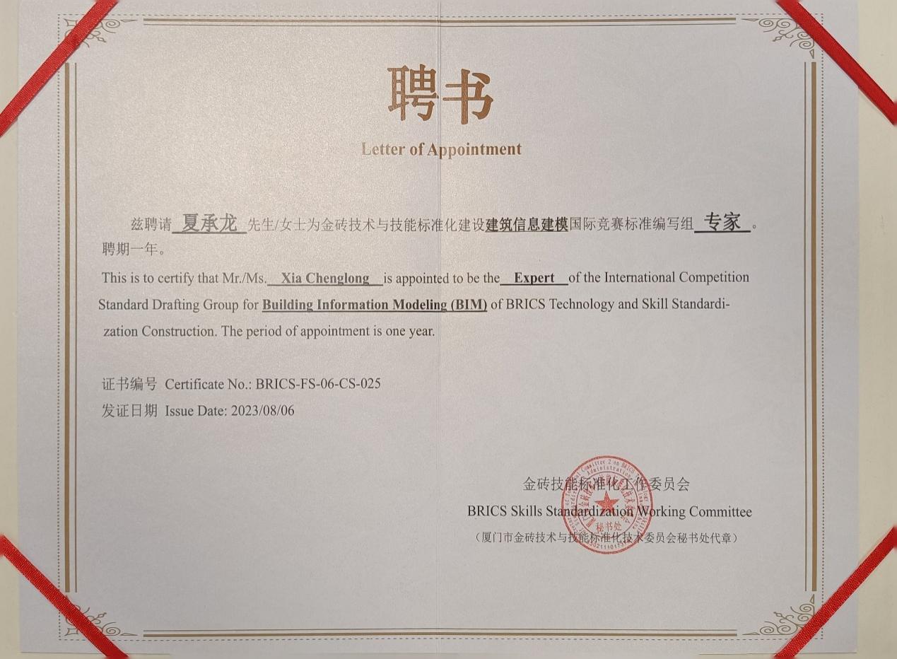 2023年8月6日,金砖技能国际团体标准制订之建筑信息建模竞赛标准制订工作会议在厦门召开。我院经济贸易学院夏承龙老师,作为金砖技能国际团体标准制订之建筑信息建模竞赛标准制订工作会议的专家,受邀参加此次标准制订相关起草、审议、修改等工作。