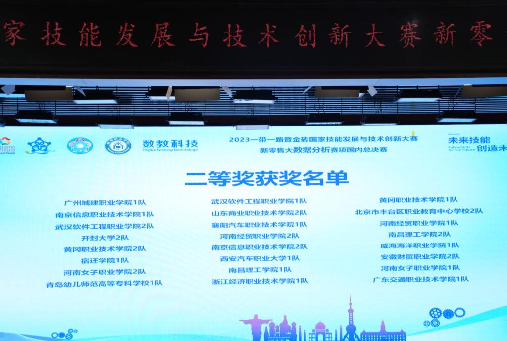 11月25日,2023“一带一路”暨金砖国家技能发展与技术创新大赛新零售大数据分析赛项国内赛决赛在安徽合肥成功举行,此次大赛全国范围内共有124支队伍参与角逐。由凌勇和孙青松老师指导的商务数据分析与应用专业解雨欣、钱炳森团队,陈小芳、吴小调老师指导的商务数据分析与应用专业李思雨、魏雨欣团队,分别获得了国内赛总决赛二等奖和三等奖。