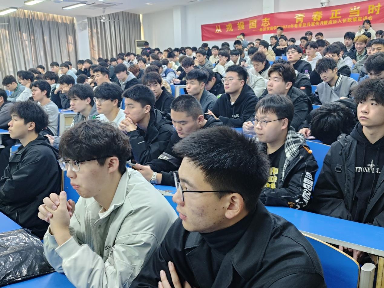 从戎报国志,青春正当时。军营是温暖人心的大家庭、培养人才的大学校,是历练人生的大熔炉、施展才华的大舞台,希望更多青年学子能够到火热的军营去放飞梦想、强健体格、砺炼品质,到祖国最需要、最艰苦的地方去施展才华、建功立业、实现价值!此次征兵政策宣讲,增强了参会人员对征兵政策的了解,为后续经济贸易学院高标准、高质量完成2024年春季征兵工作奠定了良好基础。接下来,经济贸易学院征兵工作将按照上级统一部署,严格执行各项程序步骤,确保圆满按时完成征兵任务。(供稿:张飞龙 审稿:陶云龙)