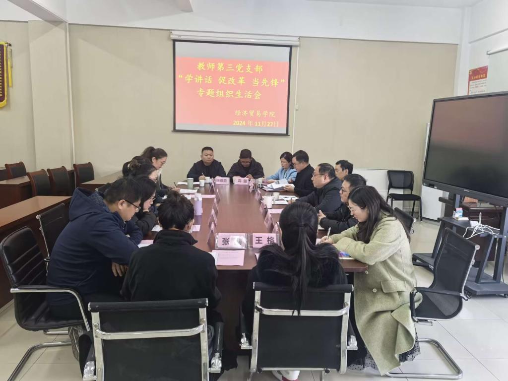 11月28日下午,经济贸易学院教师第三党支部在综合楼212办公室召开“学讲话 促改革 当先锋”专题组织生活会。教师第三党支部全体党员参加会议,省供销社机关党委三级调研员洪勇、经济贸易学院党政领导班子列席会议。会议由经济贸易学院党总支书记刘大俊主持。
