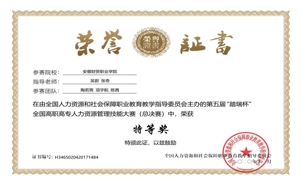 2019年“踏瑞杯”全国人力资源管理大赛一等奖;