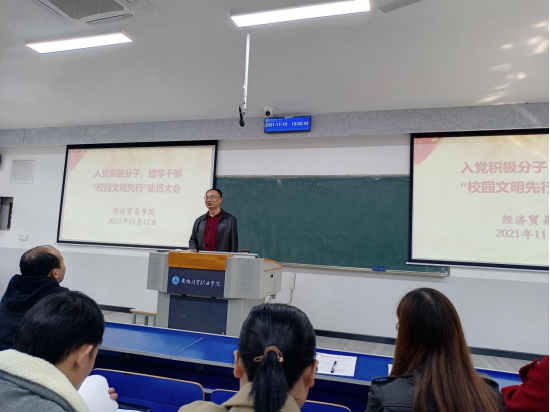 建设文明校园,让文明之花绽放校园。根据学校《进一步加强学生校园文明规范的通知》文件要求,全面贯彻落实文件精神,切实加强学生文明行为规范,形成优良班风、建设和谐校园。经济贸易学院分别于2021年11月10日召开学生文明行为规范推进会、11月12日在5201阶梯教室举行“校园文明先行”动员大会,着力部署、扎实推进学生校园文明规范工作。