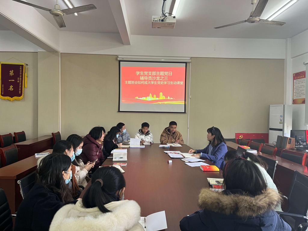 12月15日上午,为深入学习贯彻党的二十大精神,深入开展“三全育人”工作,做好新时代大学生的思想政治教育,不断提升人才培养质量,结合党史学习教育,经济贸易学院学生党支部以“辅导员沙龙:如何上好党史主题班会”为主题在综合楼212办公室举行,线上同步进行。本次沙龙活动由支部书记丁蓉主持。