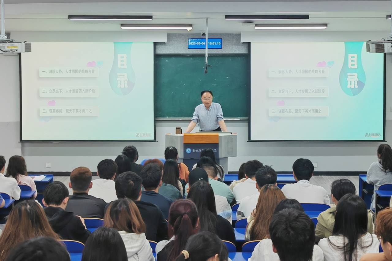 为深入学习宣传贯彻党的二十大精神,提升大学生的党性修养,5月6日下午经济贸易学院党总支书记陶云龙开展“聚人才之力 筑复兴之基”《形式与政策》专题报告,经济贸易学院全体入党积极分子及学生干部200余名学生参加学习。