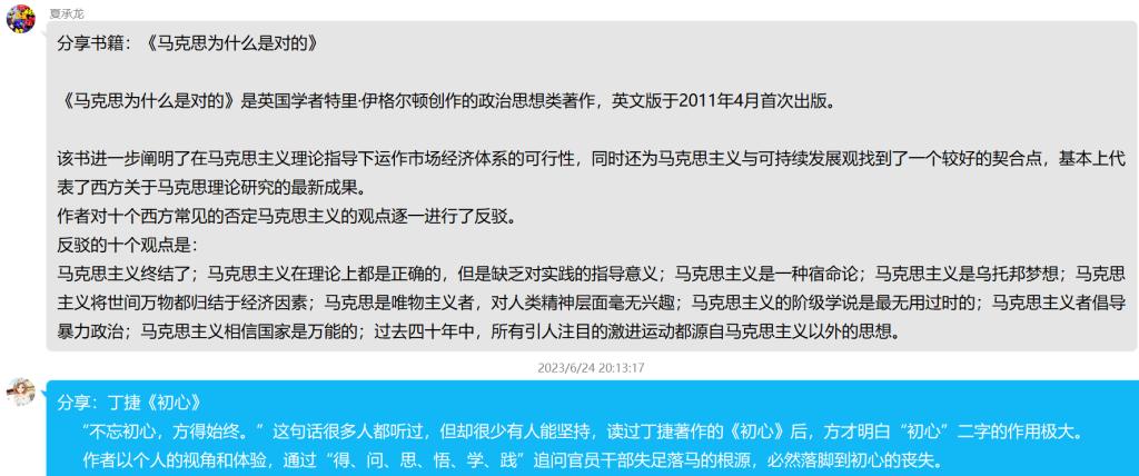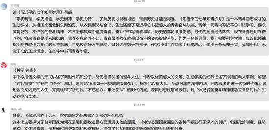 活动中,与会人员分享了自己的读书经历、体会和感悟,并进行了热烈讨论,大家一起挖掘内涵、碰撞思想。教师第四党支部书记祁隽老师说,读书能够保持思想活力、得到智慧启迪、滋养浩然之气。教师第一支部的朱清书记说在今后的工作和生活中,大家要延续阅读习惯,坚持学有所用、学以致用,把读书活动同课程思政结合,努力把读书收获转化为做好教学工作的过硬本领,以更好的状态投身学校发展大局中。教师第二党支部的马诗琴书记说读书、阅读能让党的二十大精神在师生心中落地生根,能不断激发我院教师和学生自觉努力争做有理想、敢担当、能吃苦、肯奋斗的新时代好青年。教师第五支部的郭媛媛书记说,学习之路无止境,最是书香能致远。通过参加这次阅读分享活动,今后支部将多开展喜闻乐见、内容丰富的读书活动,激发老师与学生的阅读兴趣,营造良好的学习阅读氛围,深入推进我院“书香校园”建设。教师第三支部陈江书记说,倡导广大女教师多读书、读好书、善读书,在阅读中弘扬中华优秀传统文化,在工作生活中自觉践行社会主义核心价值观,涵养家国情怀,为学校的发展建设凝聚巾帼力量!