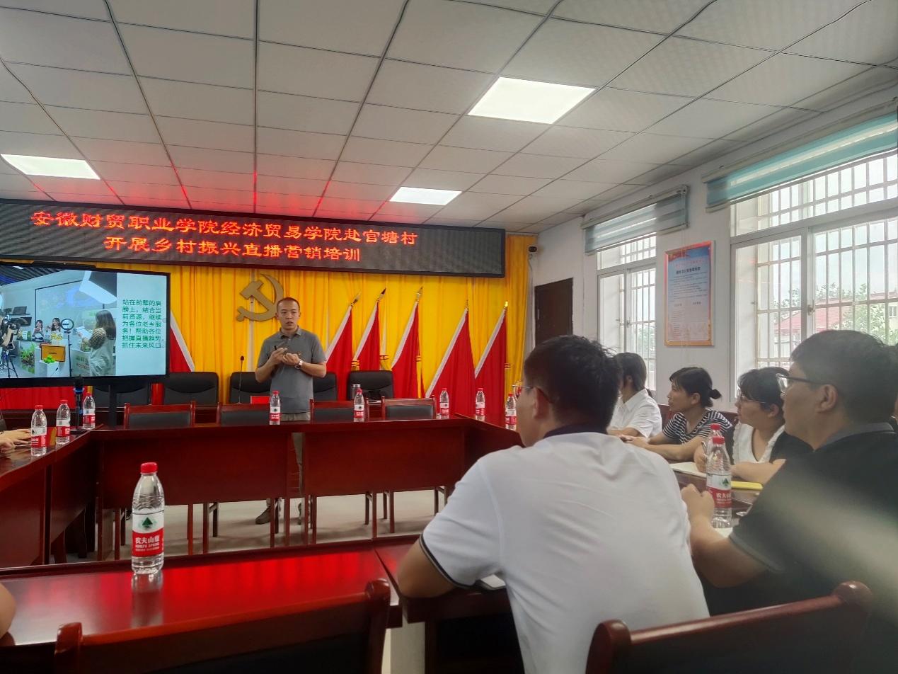 7月17日,为进一步发挥bat365官方网站乡村振兴优质校的资源优势,让乡村基层产业发展搭上“数字快车”,助力乡村振兴,舒城县百神庙镇官塘村邀请bat365官方网站经济贸易学院党总支、乡村振兴教学团队,在官塘村沣巢大讲堂举办了为期一天的直播营销培训。