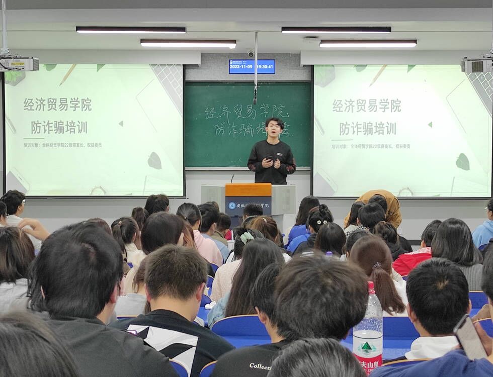 为切实增强学生识骗、防骗能力,提高学生自我防范意识,确保学生财产安全和校园平安稳定,经济贸易学院于11月9日在6101教室开展新生防诈骗培训会。参与本次活动的有经济贸易学院2022级全体权益委员及寝室长。
