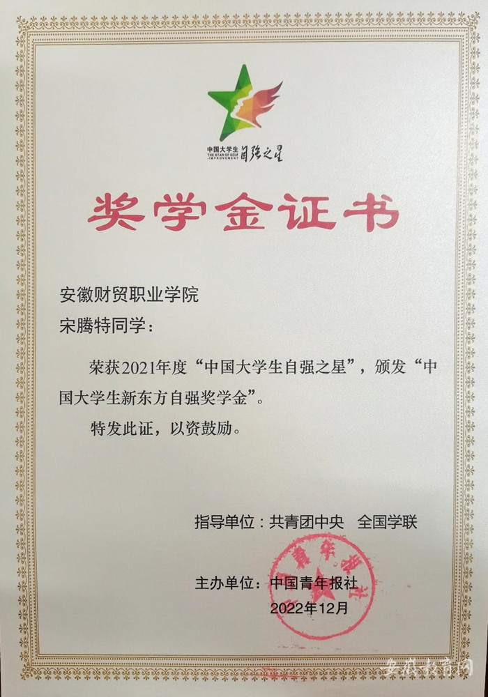 近日,由共青团中央、全国学联指导,中国青年报社开展的2021年度“中国大学生自强之星”奖学金评选活动中,bat365官方网站营销2001班宋腾特同学荣获2021年度“中国大学生自强之星”荣誉称号。