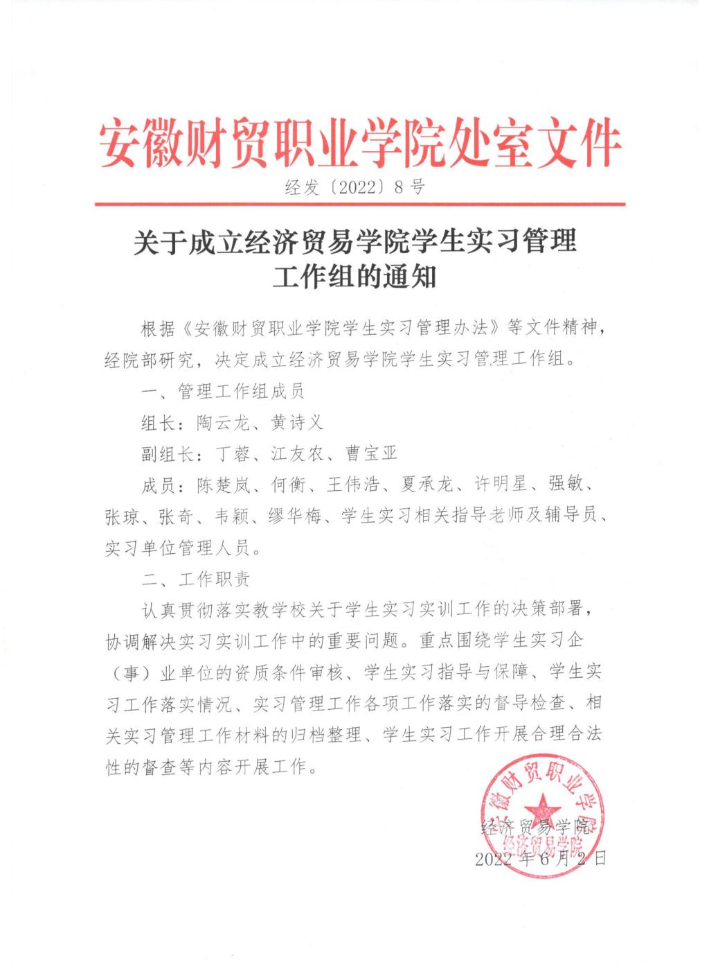 关于成立经济贸易学院学生实习管理工作组的通知