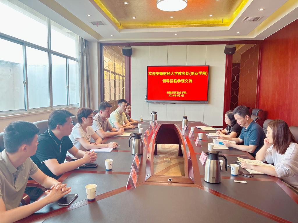 6月3日下午,安徽财经大学教务处副处长周杨波一行来我校调研交流。教务处负责人和相关科室人员参加交流座谈会。会议由教务处处长方春龙主持。