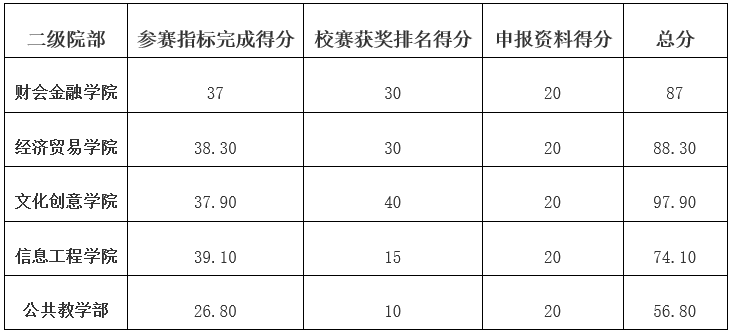 根据评审规则,经报校分管领导同意,拟确定文化创意学院、经济贸易学院获得优秀组织奖,财会金融学院、信息工程学院、公共教学部获得组织奖。