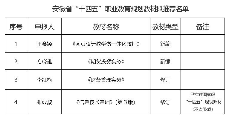 根据《安徽省教育厅关于开展“十四五”职业教育规划教材立项建设的通知》(皖教秘职成〔2022〕88号)文件要求,经专家评审,现将我校“十四五”职业教育省级规划教材推荐申报评审结果予以公示。