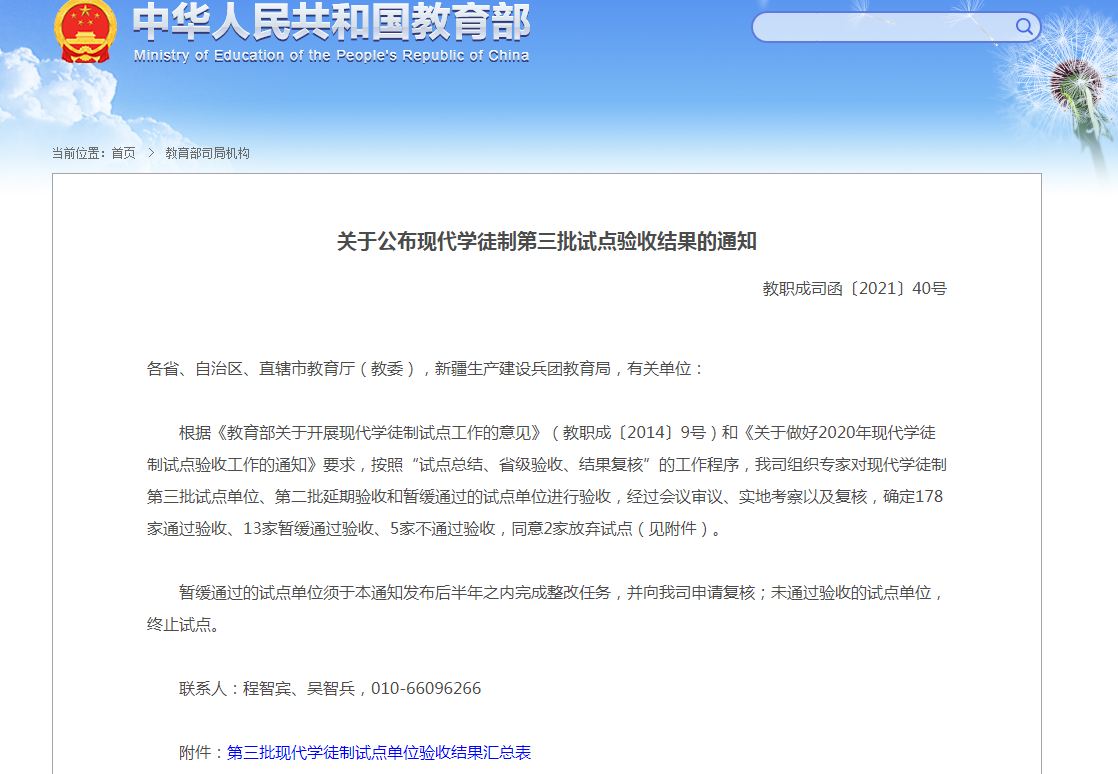 近日,教育部职业教育与成人教育司公布现代学徒制第三批试点验收结果,我校作为教育部第三批现代学徒制试点院校,顺利通过验收。