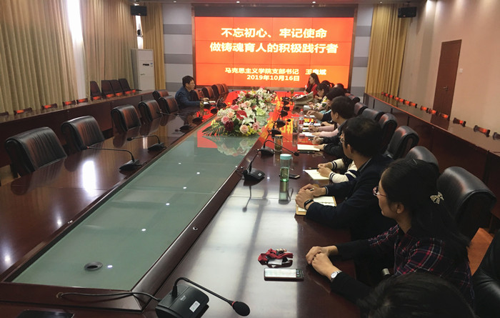 2019年10月16日下午,马克思主义学院“不忘初心、牢记使命”主题党课上,支部书记王良斌以“做铸魂育人的践行者”为题,讲述思想政治理论课教师的时代使命,通过解读习近平总书记关于教育的相关重要论述,把自己作为一名思想政治理论课教师的初心和使命弄明悟透。