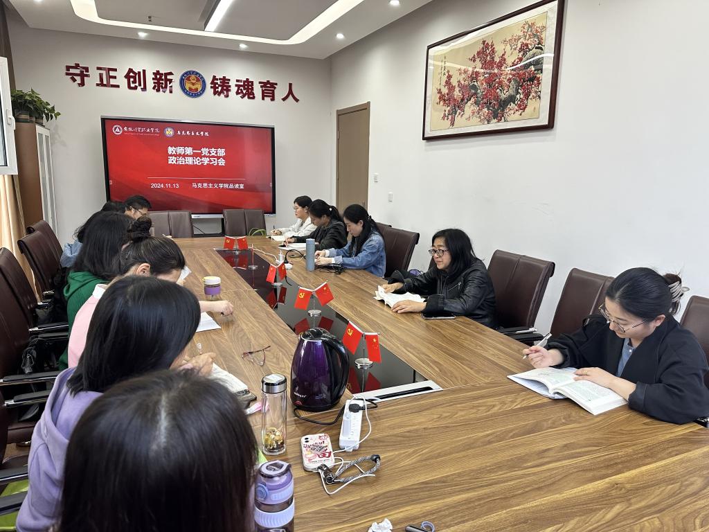 2024年11月13日下午,马克思主义学院教师第一党支部在品读室举行了11月份政治理论学习会。会议由党支部书记洪妮主持,党支部全体党员参与。
