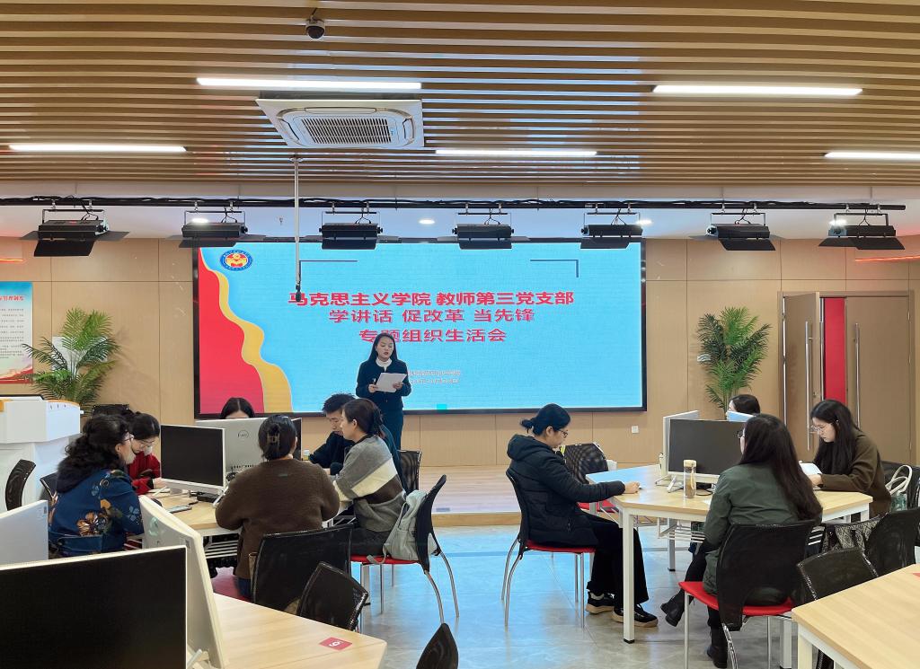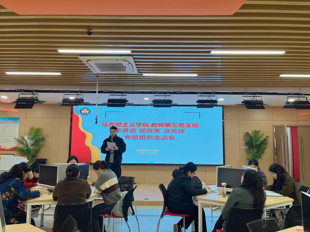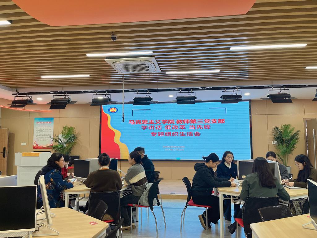 11月20日下午,马克思主义学院教师第三党支部“学讲话促改革当先锋”专题组织生活会在智慧教室召开,支部书记徐明主持会议,全体党员老师参加。