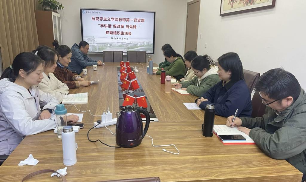 11月20日,马克思主义学院教师第一党支部召开“学讲话、促改革、当先锋”专题组织生活会,会议旨在深入学习贯彻习近平总书记在安徽考察时的重要讲话精神,推动学院教育教学改革,激励党员教师发挥先锋模范作用。