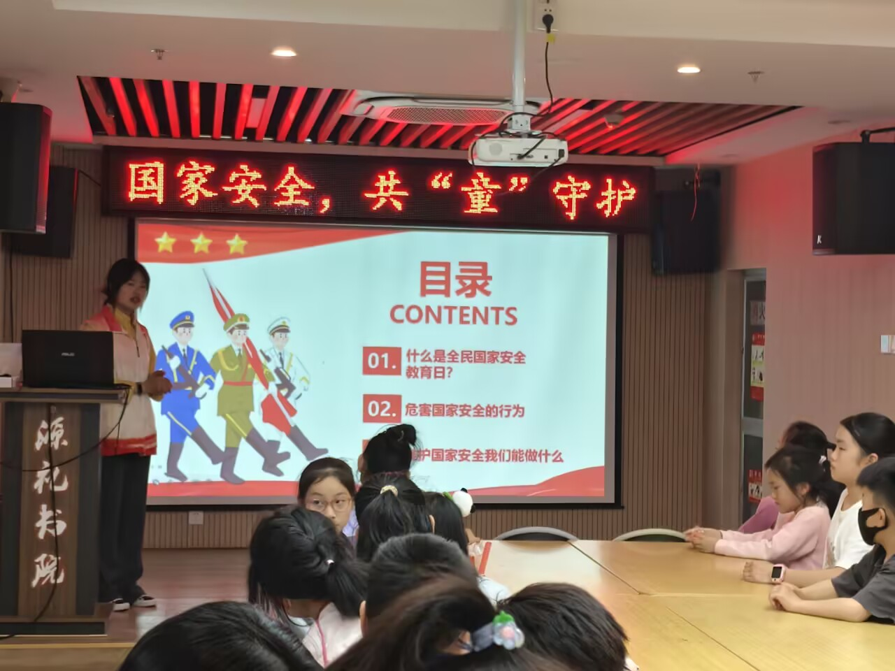 活动中,志愿者以《国家安全知多少》动画短片为切入点,通过生动有趣的动画和通俗解说,向孩子们阐释总体国家安全观内涵。结合PPT课件,围绕"全民国家安全教育日"主题,重点讲解网络安全、生态安全等与日常生活密切相关的国家安全知识,并设置"校园欺凌应对""陌生来电处理"等情景模拟环节。孩子们在互动问答、角色扮演中深化对"国家安全人人有责"的理解。
