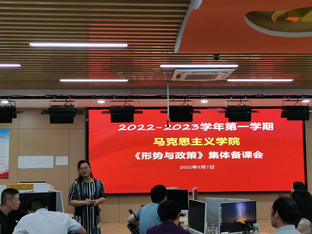 为落实学校集体备课通知精神,统一教师教学设计思想,提升课程教学质量。9月7日,马克思主义学院在智慧实训室开展了2022-2023学年第一学期《形势与政策》集体备课会,马克思主义学院全体教师及行政兼教老师参与备课。