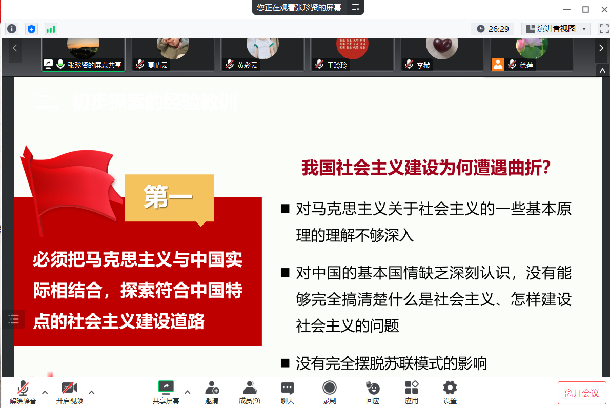 会上,张珍贤老师主讲了专题五《社会主义建设道路初步探索的理论成果》的备课思路。张老师认为本章教学的理论性较强,应在吃透教材内容的基础上,辅助以视频或案例,讲清楚何为争取一切积极因素;如何理解社会主义社会基本矛盾运动又相适应又相矛盾;如何看待初步探索时期的农业、轻工业、重工业发展情况的合理性存在。张珍贤认为本章的重难点是初步探索的经验教训。
