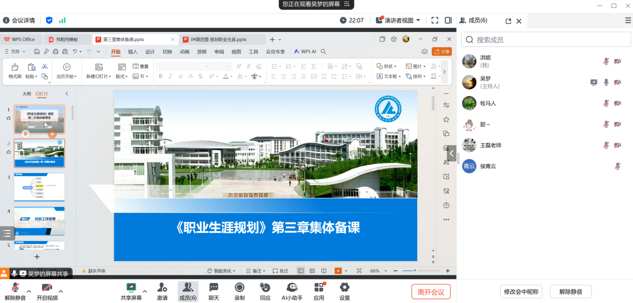 9月20日晚上,马克思主义学院《职业生涯规划》课程组线上召开本学期第二次集体备课会,备课会由课程责任人吴梦老师主持,教研室主任洪妮老师和全体课程组教师参会。