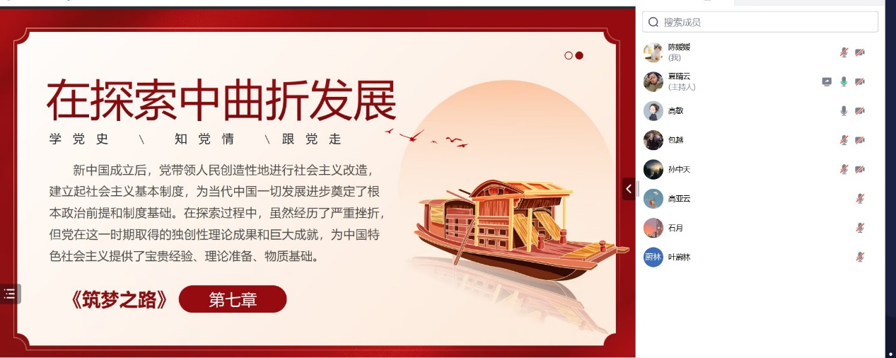 夏晴云老师以视频导入方式,分析了党带领人民在社会主义探索时期取得的独创性理论成果和巨大建设成就。高敏老师通过视听结合、史论结合的方式,阐述了“建设有中国特色社会主义”的教学内容,分享了教学重难点。与会教师对主讲内容进行了认真研讨,并表示要继续深入学习,准确把控教学节奏,讲好党史故事,引领学生传承红色基因。