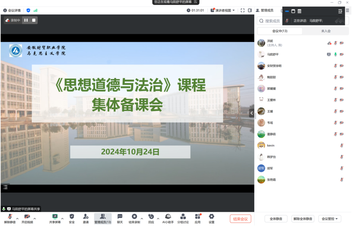 10月24日晚,马克思主义学院《思想道德与法治》课程组召开线上集体备课会,备课会由舒平老师主持,全体授课教师参会。