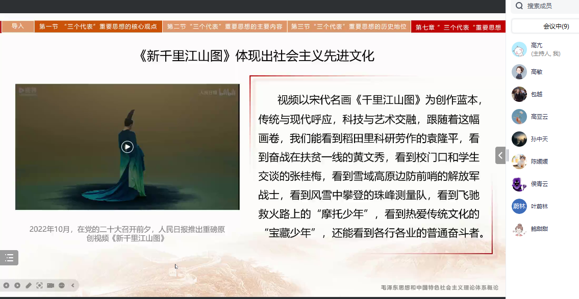5月29日晚,毛泽东思想和中国特色社会主义理论体系概论教研室通过线上形式召开第八次集体备课会,专题研讨“三个代表”重要思想教学要点。教研室全体教师参加本次备课活动。