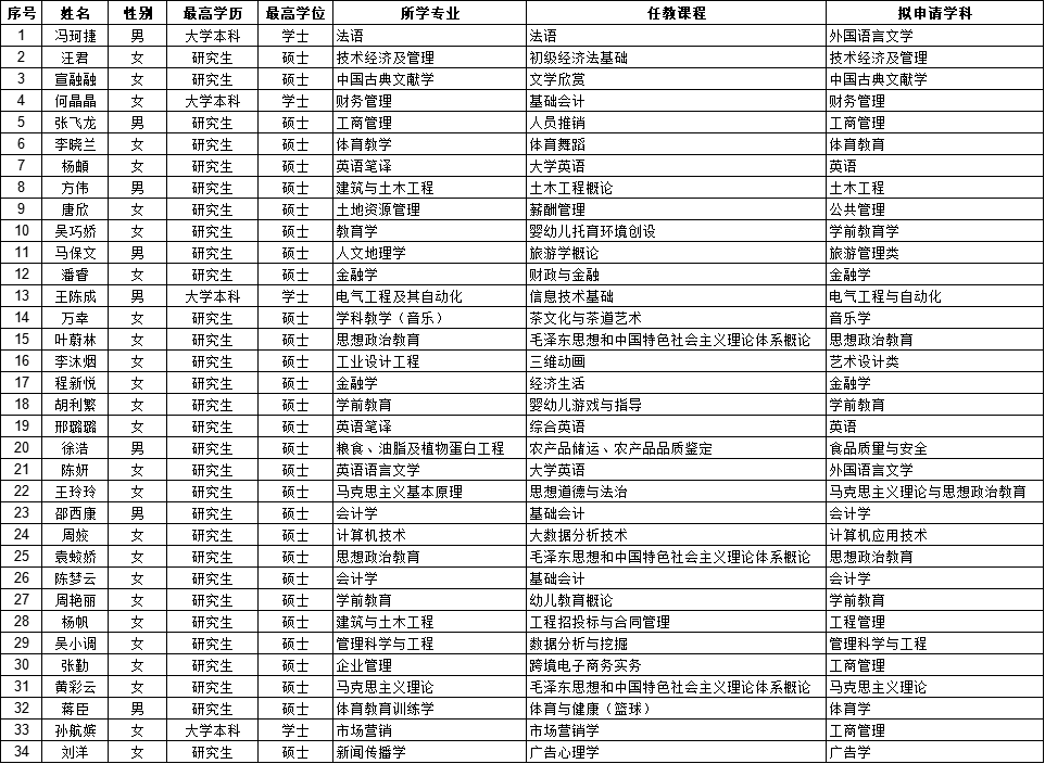 根据《安徽省教育厅关于做好2022年高等学校教师资格认定工作的通知》(皖教秘人〔2022〕85号)、《关于做好2022年高等学校教师资格认定工作的通知》(组发〔2022〕20号)等文件精神,经网上报名、现场确认、教育教学基本素质和能力测试等工作程序,现将2022年学院教师资格认定初审合格人员予以公示,具体名单如下: