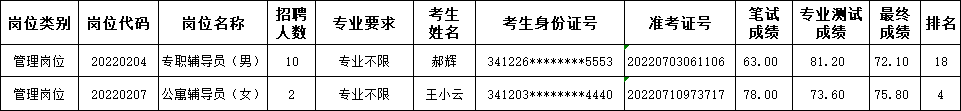 在学院2022年度编外聘用人员公开招聘中,因考生放弃,专职辅导员(男)(20220204)、公寓辅导员(女)(20220207)两个岗位共缺额2人。