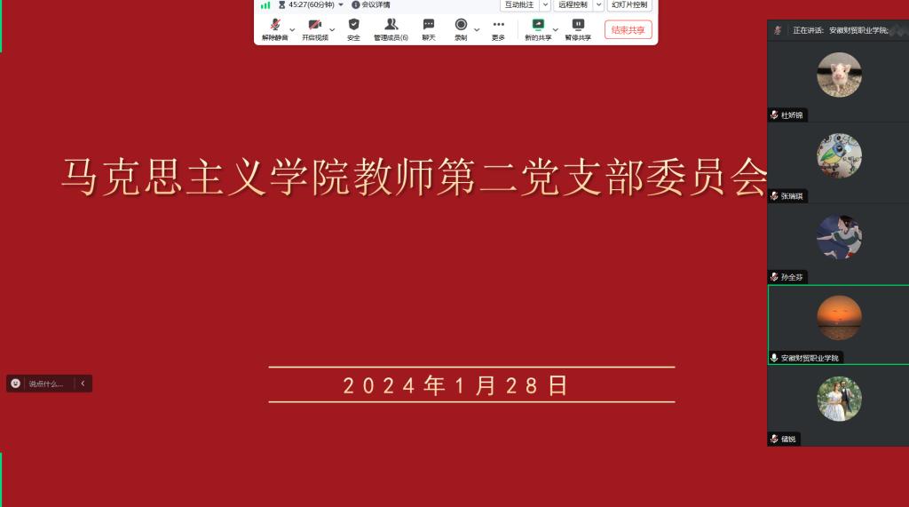 1月28日,马克思主义学院教师第二党支部通过腾讯会议召开一月份支部委员会会议,全体支部委员参加,支部副书记张瑞琪主持会议。