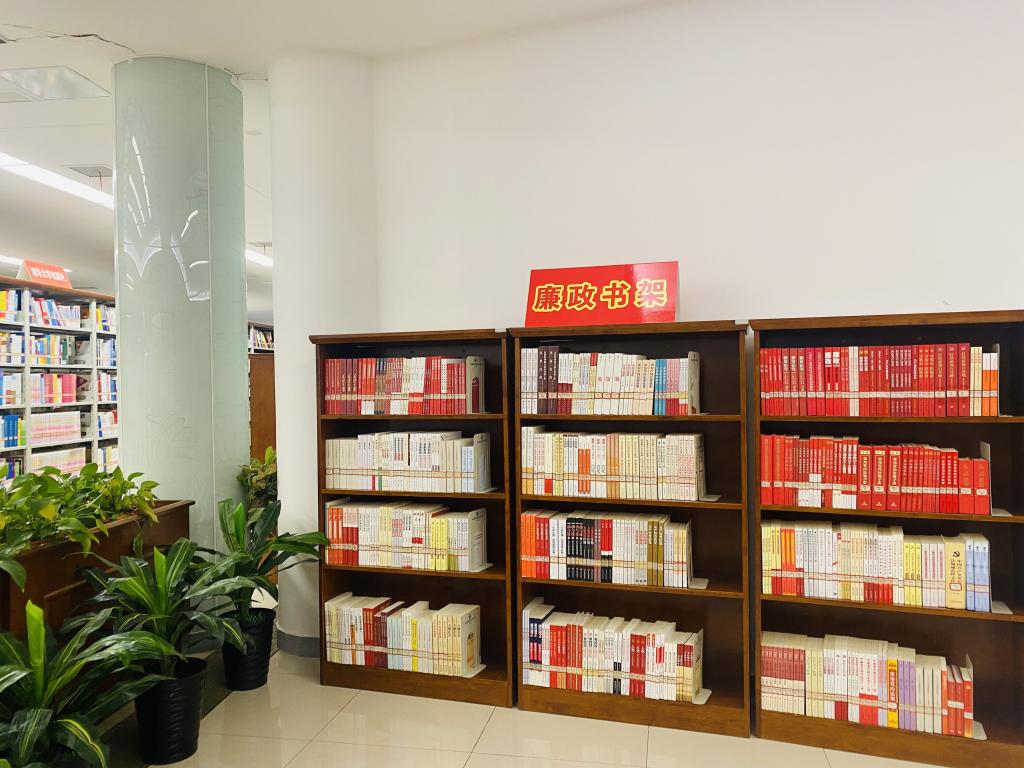 “廉政书架”上陈列着反腐倡廉热点、《中国共产党纪律处分条例》、廉政新规等勤政廉洁方面的书籍,便于读者取阅。