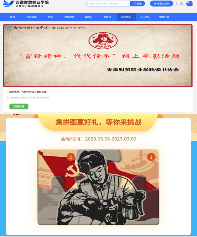 为纪念学习雷锋60周年,推动新时代学雷锋活动不断拓展内容、创新形式、丰富载体,让学雷锋活动融入日常、化作经常,近日,图书馆举办了“弘扬雷锋精神,传递爱心力量”线上点亮拼图活动,通过“点亮拼图+线上观影”创新模式,开展了为期4天线上点亮拼图活动。