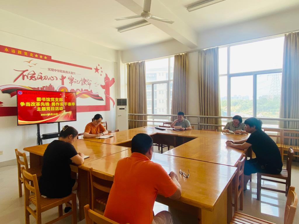 为深入学习贯彻党的二十届三中全会精神,激发党员干部的改革创新意识和实干担当精神,图书馆党支部于9月10日在党员活动室开展了“争当改革先锋 勇作实干表率”主题党日活动。