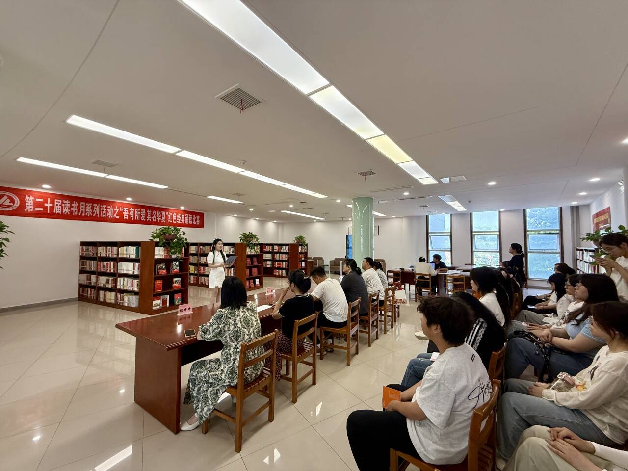 5月7日下午,第二十届读书月系列活动之“吾有所爱 其名华夏”红色经典诵读比赛在图书馆二楼红色阅读空间精彩上演。图书馆馆员代表与马克思主义学院思政教师代表共同担任赛事评委。