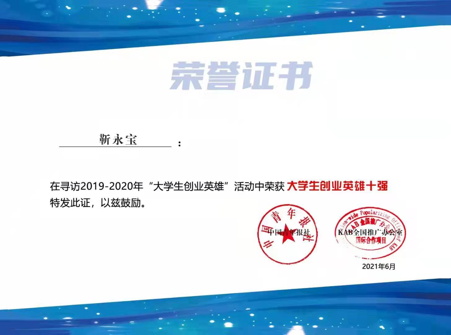 近日,“寻访2019-2020年全国大学生创业英雄”活动结果揭晓,我校毕业生靳永宝获评“全国大学生创业英雄10强”。