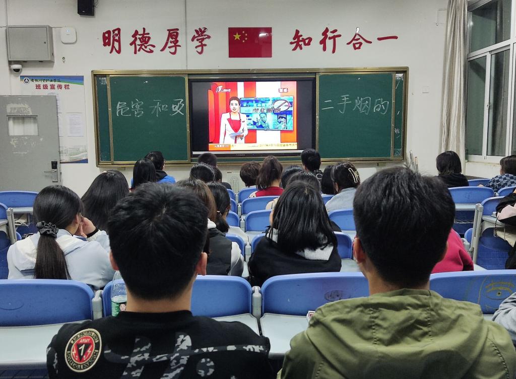观看禁烟宣传视频,了解抽烟危害。校团委组织各班级团支部利用口语训练时间进行“吸烟危害”的大讨论和观看禁烟视频。通过讨论和观看视频,同学们更深刻的了解到吸烟以及吸入二手烟对身体造成的不可逆的危害。