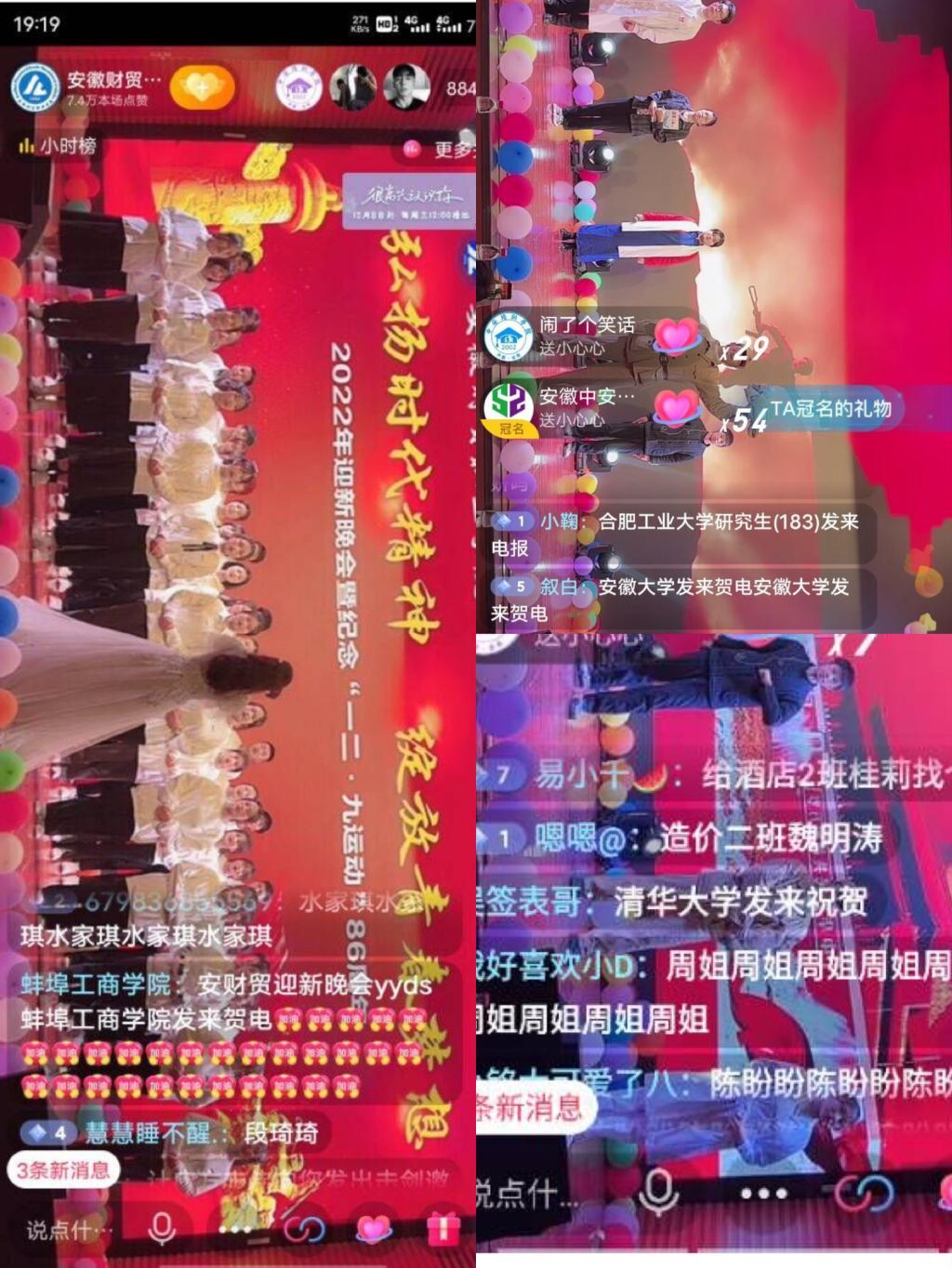 晚会通过线上新媒体平台官方抖音账号全程网络同步直播。安徽大学、合肥工业大学、蚌埠工商学院、安徽农业大学、阜阳师范大学等省内外多所高校发来祝贺,线上观看单场点赞人数高达7.5万人次。