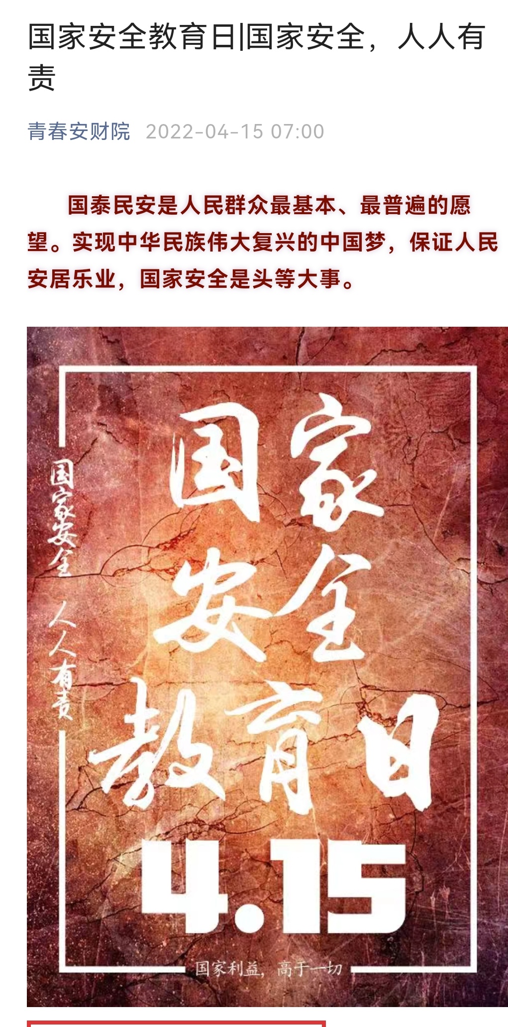 国家安全,人人有责。为落实对国家安全教育日的宣传工作,校团委通过“青春安财院”微信公众号、团委抖音平台和校园广播等形式,大力宣传相关知识,引导大学生积极遵法守法,维护国家安全。