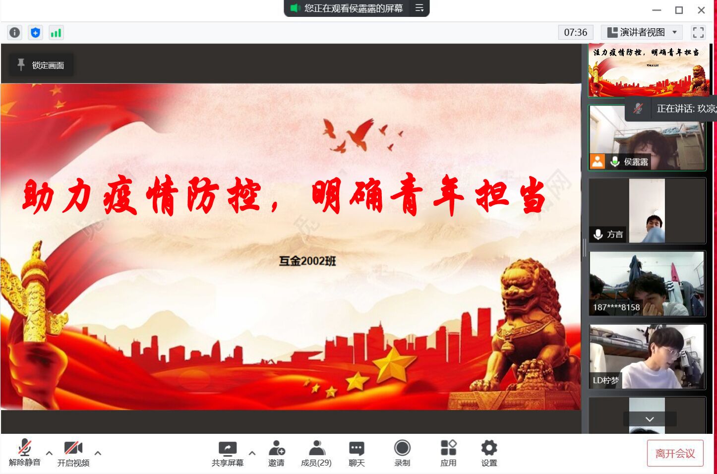 立即行动,坚定战“疫”信心。校团委组织开展“助力疫情防控,明确青年担当”主题团日活动,发挥团组织战斗堡垒作用。 212个在校班级团支部积极组织学习《学生疫情防控期间学习生活健康指南》《违反疫情防控管理秩序的行为及法律后果明白纸》等文件精神,让同学们及时了解当下的疫情防控相关要求并严肃对待。坚持每日健康打卡,加强自我监测,网格化管理,积极配合所在学院做好信息排查,做好自己的“健康第一责任人”。