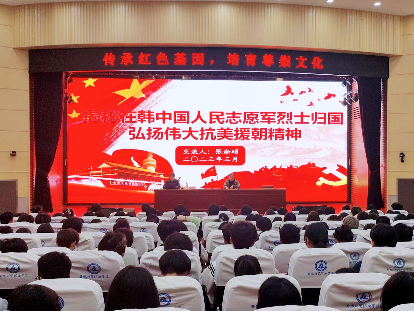 根据安徽省教育厅转发关于印发《“传承红色基因培育尊崇文化”系列主题活动方案》的文件精神和安徽省退役军人事务厅推荐,活动特邀退役军人事务部“百名老兵红色宣讲团”成员、安徽省直机关工委讲师团“身边讲堂”成员张淞硕同志来校开展《揭秘在韩中国人民志愿军烈士遗骸归国,弘扬伟大抗美援朝精神》专题讲座。