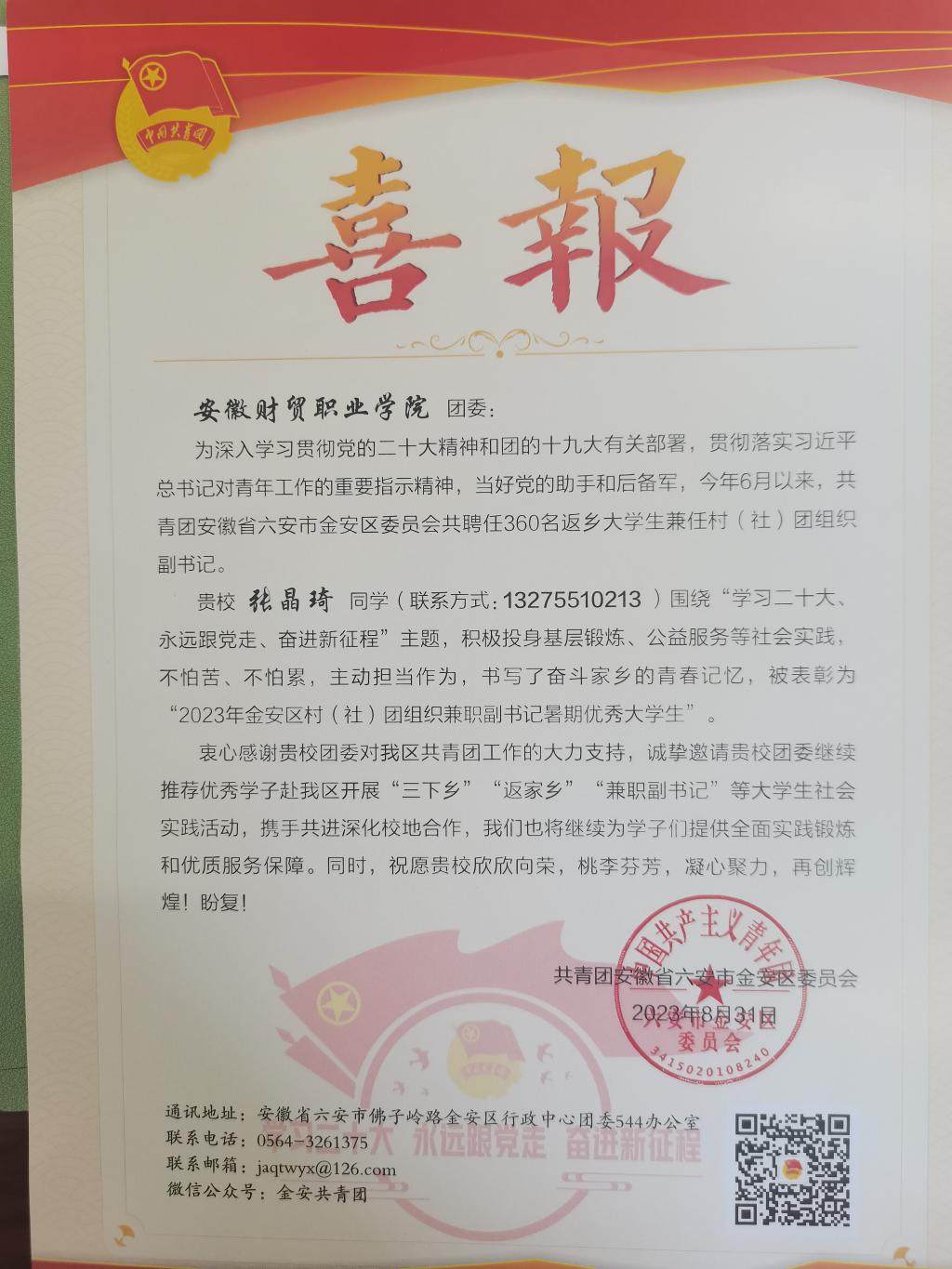 近日,校团委收到共青团安徽省六安市金安区委员会发来的喜报,感谢财会金融学院会计2206班张晶琦同学在大学生暑期三下乡社会实践活动“返家乡”中所做出的积极贡献。