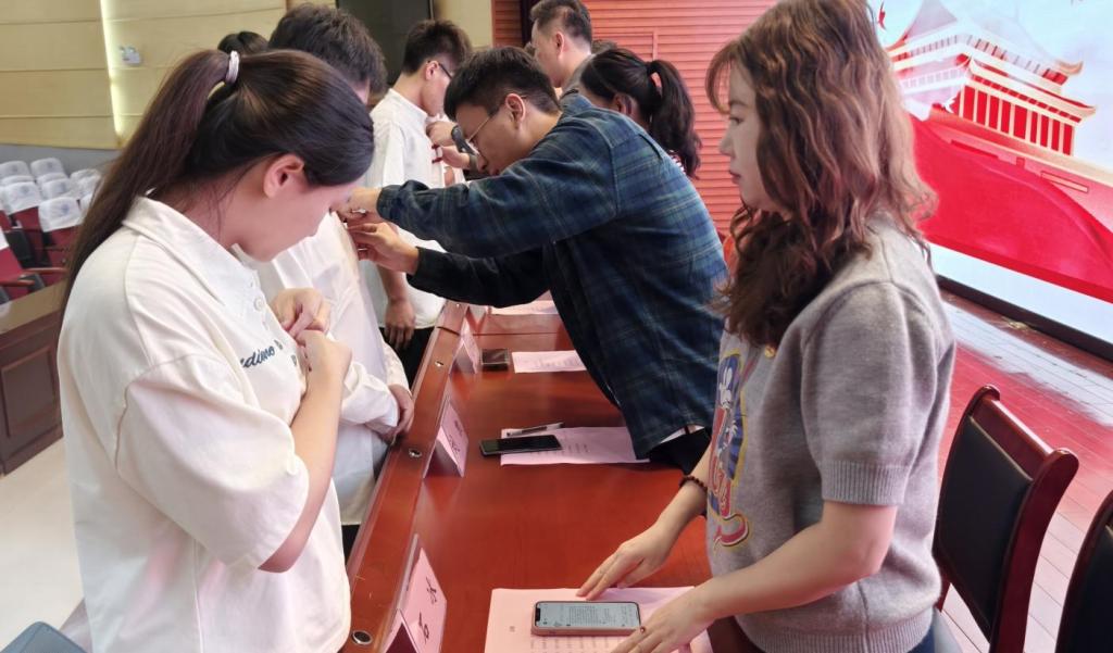 紧接着,在鲜艳的团旗下,出席会议的各位领导、老师为新团员代表佩戴团徽,并合影留念。