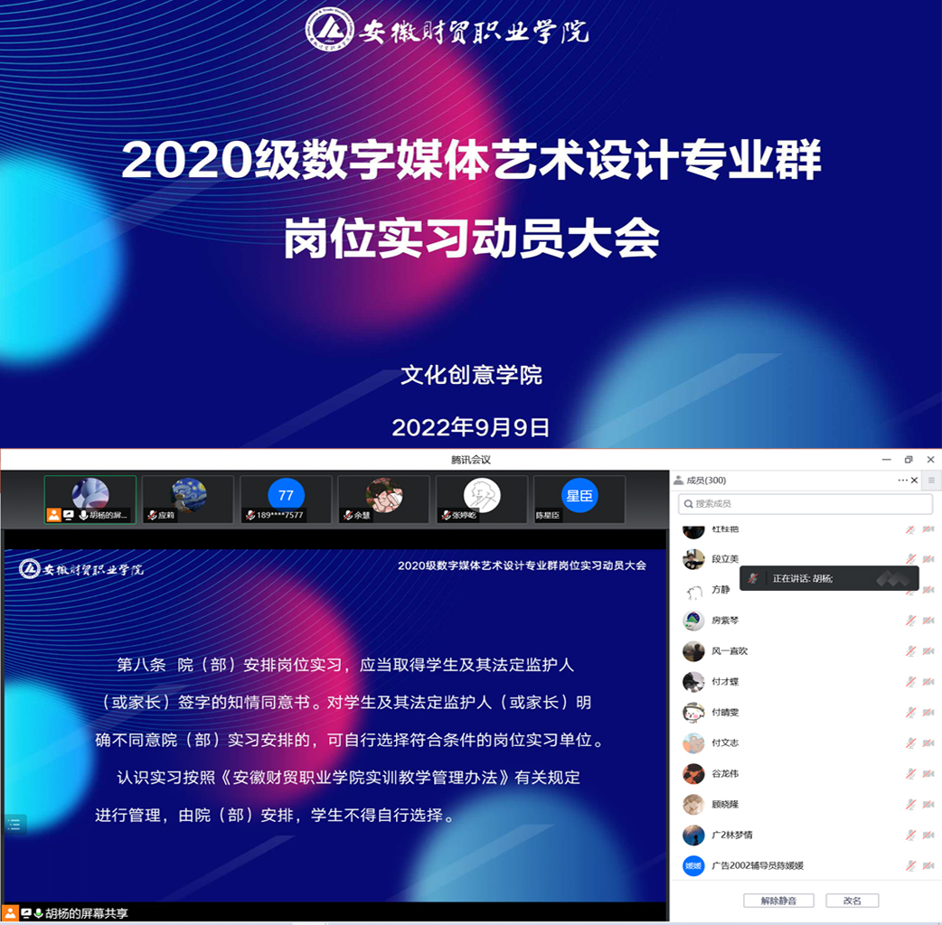 为进一步完善岗位实习工作,引导学生做好岗位实习前的各项准备,推进实习工作的顺利进行,文化创意学院数字媒体艺术设计专业群在腾讯会议召开了2020级数字媒体艺术设计专业群岗位实习动员大会。文化创意学院党总支书记张克、院长郭湘如、党总支副书记宋凌云、副院长高静、全体指导老师、2020级全体辅导员以及2020级广告艺术设计专业、环境艺术设计专业、动漫设计专业全体学生参加此次会议。