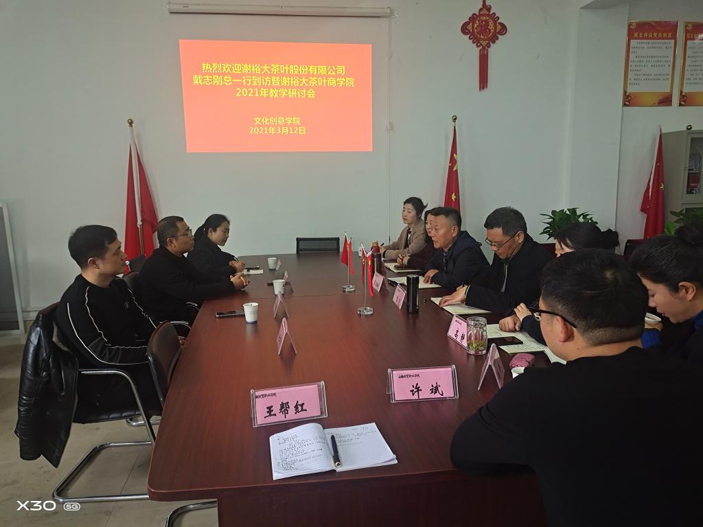 3月12日下午,谢裕大茶叶股份有限公司人力资源总监戴志刚一行来到文化创意学院洽谈校企合作及谢裕大茶叶商学院2021年教学研讨。文化创意学院党总支书记张克、院长郭湘如、副书记宋凌云、副院长高静、办公室主任王帮红、茶旅教研室主任钱晓慧等出席会议,双方围绕产教融合、校企合作、顶岗实习及谢裕大茶叶商学院办学等方面进行了深入地交流。
