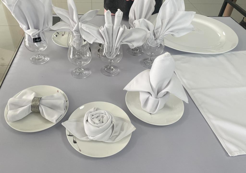 本次比赛,经过《餐饮》课程的学习以及初步考核,最终选拔了14名同学参加决赛。此次比赛主题为餐巾折花,要求参赛选手在10分钟内折出10种花型,评委老师从折花造型、操作时长及手法、仪容仪表等方面综合评价选手表现。