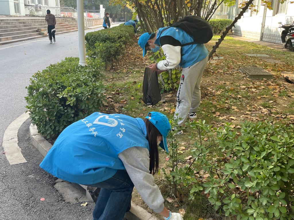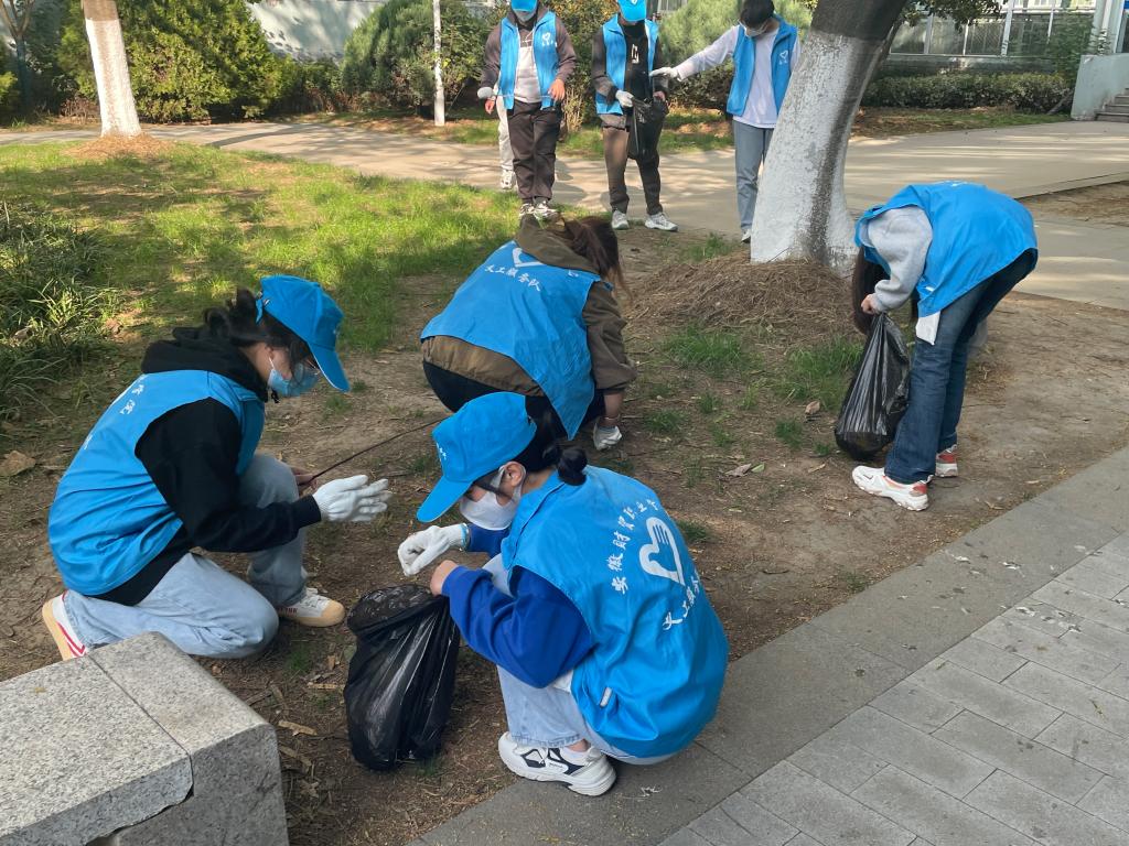 在活动负责人的指导下,志愿者们分工合作,互相配合,进行校园卫生劳动。他们身着志愿服,手持卫生工具,对台阶、草地等处落叶、烟头、白色污染垃圾进行清扫;将垃圾装袋并整理打包,使校园一角焕然一新。