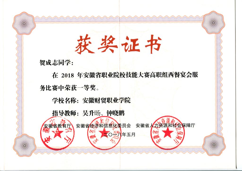 2018省赛西餐宴会服务赛项一等奖证书: