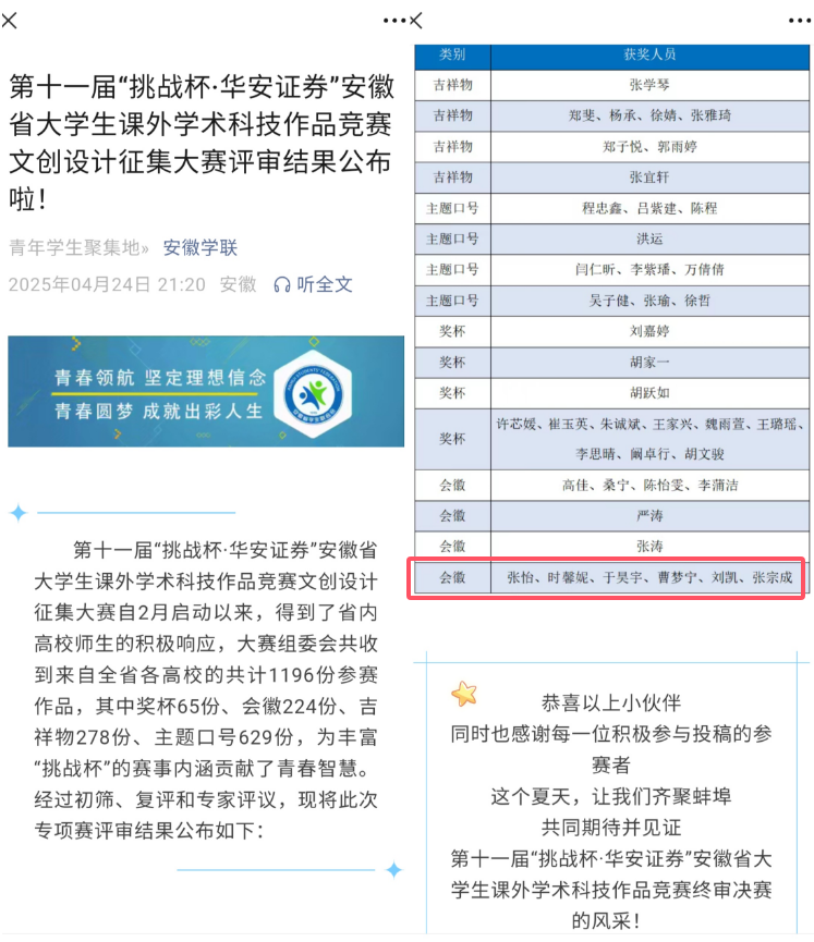 此次“挑战杯”安徽省大学生课外学术科技作品竞赛文创设计征集大赛,充分展示了大学生积极向上的精神风貌和勇于创新的时代风采,也是我院“三全育人”与“以赛促学”的实践成果体现,接下来,学院将继续以“挑战杯”等系列赛事为内驱动力,不断加强学生科技创新能力的培养,引导和激励更多青年学生积极投身到学术科技创新实践中去。(供稿:刘凯 张宗成 审稿:倪晶晶)